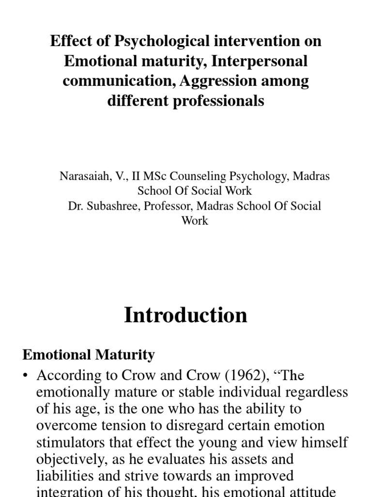 The tools used were emotional maturity scale of y. 33 sample and sampling procedure it is not possible to collect data from all the members of a population and. No significant differences exist among actualizers par actualizers and non actualizers on the basis of their anxiety emotional maturity and social maturity. Smitson1974 emotional maturity is a process in which the personality is continuously striving for greater sense of emotions health both inters physically and intra personally.