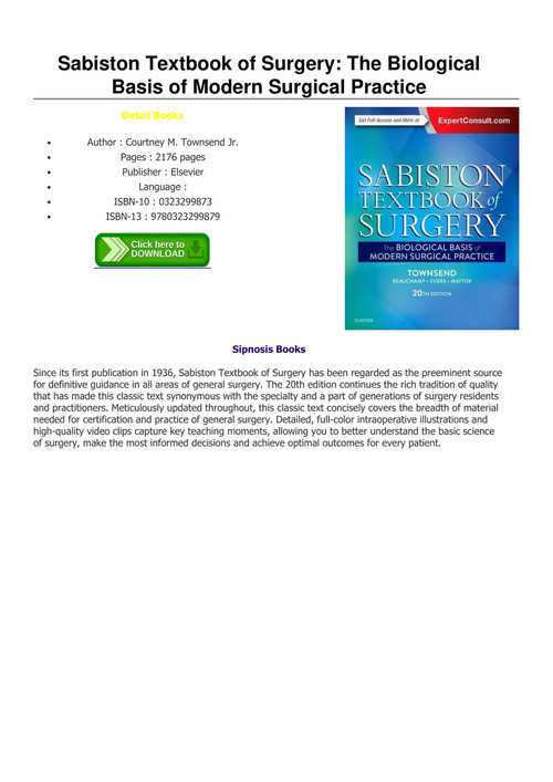 Download sabiston textbook of surgery pdf. If you really like the book you should purchase it from original author to give some credit for his hard work. The 18th edition of the sabiston textbook of surgery refl ects these exciting changes and new knowledge. The 20th edition continues the rich tradition of quality that has made this classic text synonymous with the specialty and a part of generations of surgery residents and practitioners.