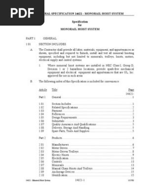 14621 Monorail Hoist System Electric Motor Specification