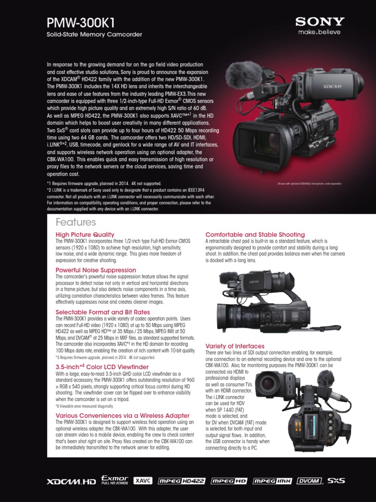 View and download sony pmw 300k1 operating instructions manual online. Now sony evolves the xdcam ex lineup further with the introduction of the pmw ex3 camcorder and the pmw ex30 deck. Pmw 300k1 camcorder pdf manual download. The camcorder also comes with two auto focusing zoom lens packages one for a 14x pmw 300k1 and the other a 16x zoom lens pmw 300k2.